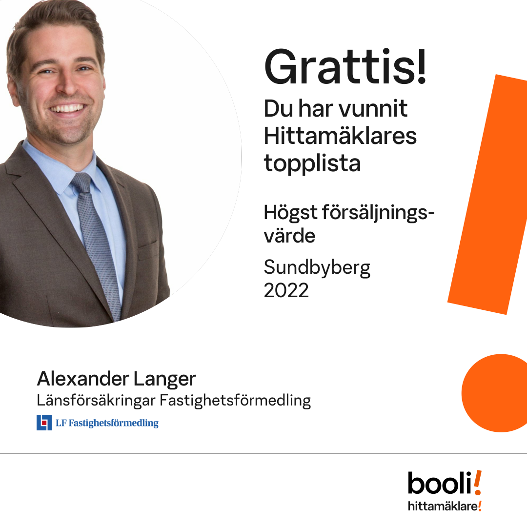 Statistik för publicerade bostäder, försäljningar och omdömen baseras på data från Booli och Hittamäklare. Statistiken för försäljningar avser inrapporterade och verifierade slutpriser från mäklare eller av Booli inhämtade och verifierade slutpriser. Statistiken för publicerade bostäder baseras på information som publicerats på Booli.se. Statistik för omdömen och rekommendationer baseras på omdömen från säljare som lämnats via Booli och Hittamäklare.