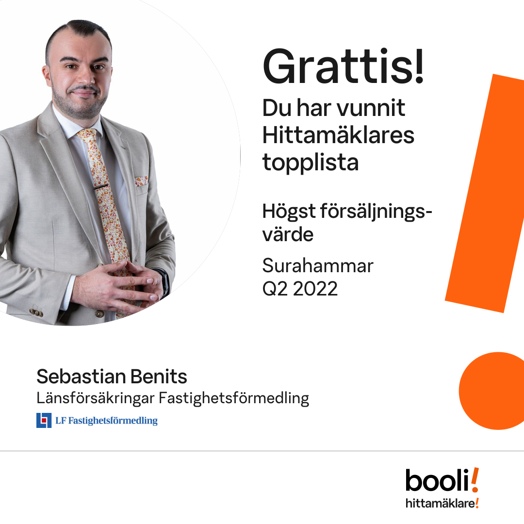Statistik för publicerade bostäder, försäljningar och omdömen baseras på data från Booli och Hittamäklare. Statistiken för försäljningar avser inrapporterade och verifierade slutpriser från mäklare eller av Booli inhämtade och verifierade slutpriser. Statistiken för publicerade bostäder baseras på information som publicerats på Booli.se. Statistik för omdömen och rekommendationer baseras på omdömen från säljare som lämnats via Booli och Hittamäklare.