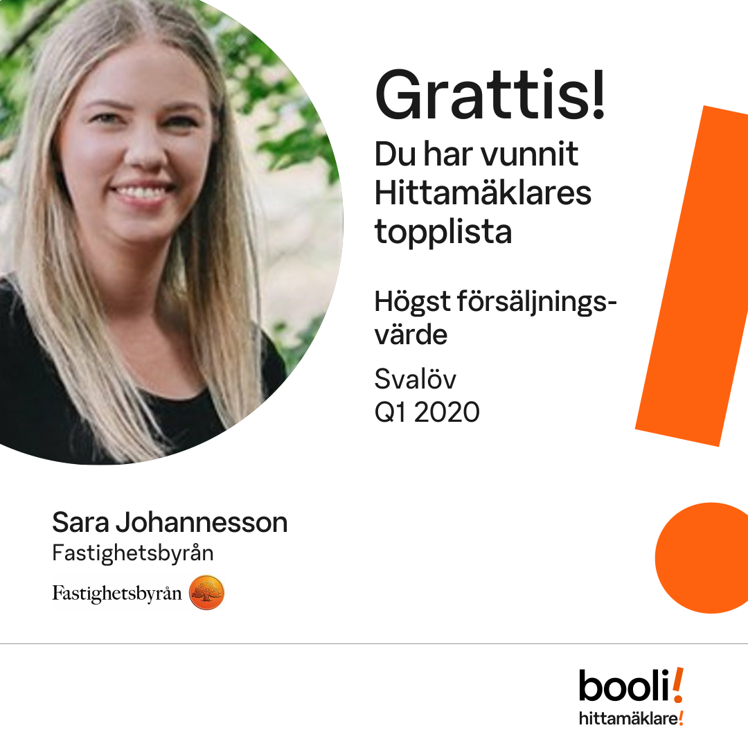 Statistik för publicerade bostäder, försäljningar och omdömen baseras på data från Booli och Hittamäklare. Statistiken för försäljningar avser inrapporterade och verifierade slutpriser från mäklare eller av Booli inhämtade och verifierade slutpriser. Statistiken för publicerade bostäder baseras på information som publicerats på Booli.se. Statistik för omdömen och rekommendationer baseras på omdömen från säljare som lämnats via Booli och Hittamäklare.