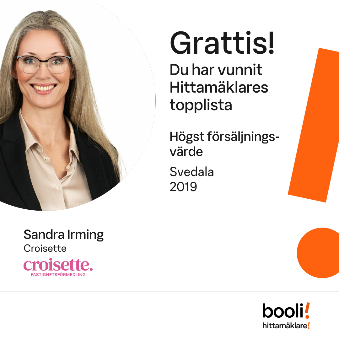 Statistik för publicerade bostäder, försäljningar och omdömen baseras på data från Booli och Hittamäklare. Statistiken för försäljningar avser inrapporterade och verifierade slutpriser från mäklare eller av Booli inhämtade och verifierade slutpriser. Statistiken för publicerade bostäder baseras på information som publicerats på Booli.se. Statistik för omdömen och rekommendationer baseras på omdömen från säljare som lämnats via Booli och Hittamäklare.