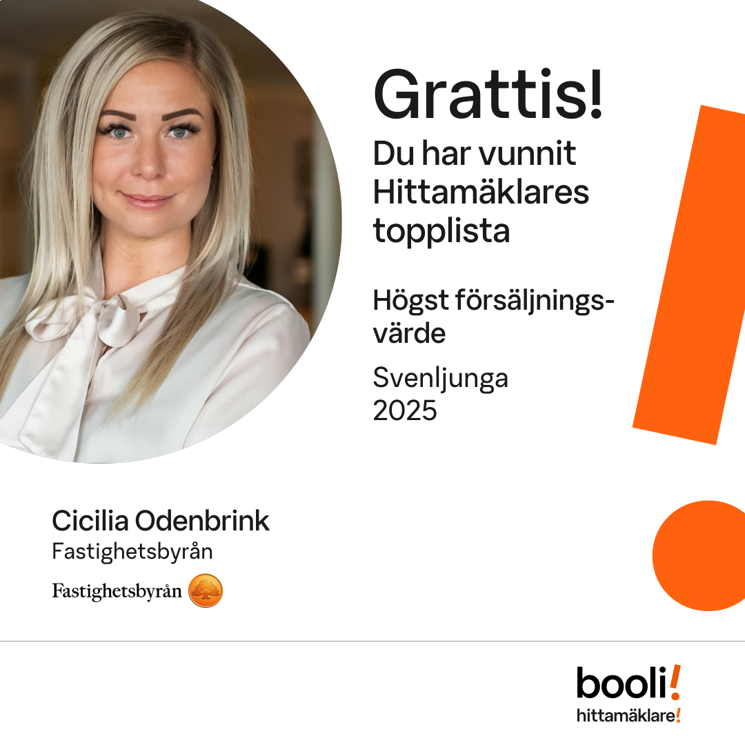 Statistik för publicerade bostäder, försäljningar och omdömen baseras på data från Booli och Hittamäklare. Statistiken för försäljningar avser inrapporterade och verifierade slutpriser från mäklare eller av Booli inhämtade och verifierade slutpriser. Statistiken för publicerade bostäder baseras på information som publicerats på Booli.se. Statistik för omdömen och rekommendationer baseras på omdömen från säljare som lämnats via Booli och Hittamäklare.
