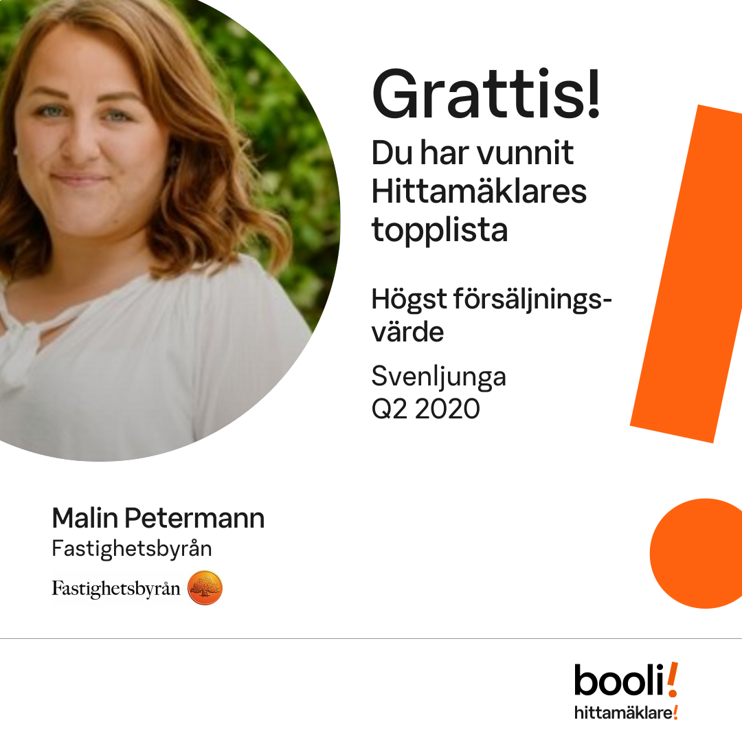 Statistik för publicerade bostäder, försäljningar och omdömen baseras på data från Booli och Hittamäklare. Statistiken för försäljningar avser inrapporterade och verifierade slutpriser från mäklare eller av Booli inhämtade och verifierade slutpriser. Statistiken för publicerade bostäder baseras på information som publicerats på Booli.se. Statistik för omdömen och rekommendationer baseras på omdömen från säljare som lämnats via Booli och Hittamäklare.