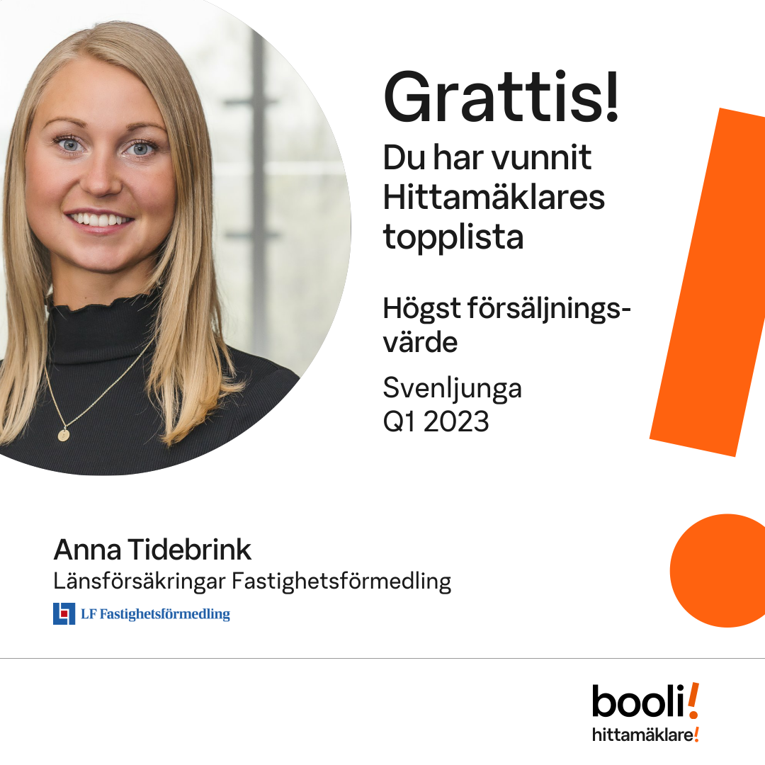 Statistik för publicerade bostäder, försäljningar och omdömen baseras på data från Booli och Hittamäklare. Statistiken för försäljningar avser inrapporterade och verifierade slutpriser från mäklare eller av Booli inhämtade och verifierade slutpriser. Statistiken för publicerade bostäder baseras på information som publicerats på Booli.se. Statistik för omdömen och rekommendationer baseras på omdömen från säljare som lämnats via Booli och Hittamäklare.
