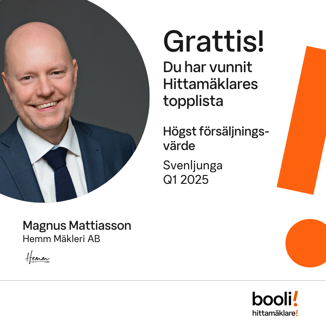 Statistik för publicerade bostäder, försäljningar och omdömen baseras på data från Booli och Hittamäklare. Statistiken för försäljningar avser inrapporterade och verifierade slutpriser från mäklare eller av Booli inhämtade och verifierade slutpriser. Statistiken för publicerade bostäder baseras på information som publicerats på Booli.se. Statistik för omdömen och rekommendationer baseras på omdömen från säljare som lämnats via Booli och Hittamäklare.