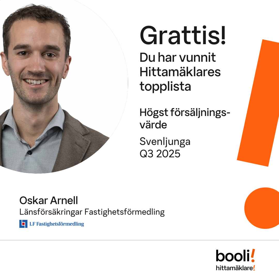 Statistik för publicerade bostäder, försäljningar och omdömen baseras på data från Booli och Hittamäklare. Statistiken för försäljningar avser inrapporterade och verifierade slutpriser från mäklare eller av Booli inhämtade och verifierade slutpriser. Statistiken för publicerade bostäder baseras på information som publicerats på Booli.se. Statistik för omdömen och rekommendationer baseras på omdömen från säljare som lämnats via Booli och Hittamäklare.