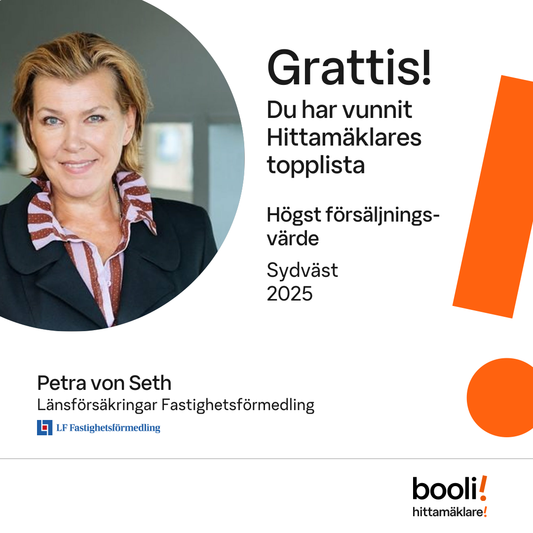 Statistik för publicerade bostäder, försäljningar och omdömen baseras på data från Booli och Hittamäklare. Statistiken för försäljningar avser inrapporterade och verifierade slutpriser från mäklare eller av Booli inhämtade och verifierade slutpriser. Statistiken för publicerade bostäder baseras på information som publicerats på Booli.se. Statistik för omdömen och rekommendationer baseras på omdömen från säljare som lämnats via Booli och Hittamäklare.