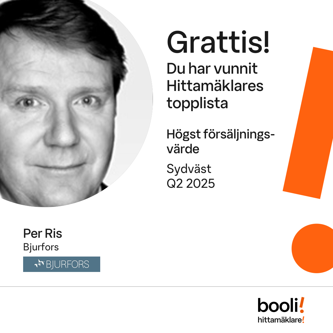 Statistik för publicerade bostäder, försäljningar och omdömen baseras på data från Booli och Hittamäklare. Statistiken för försäljningar avser inrapporterade och verifierade slutpriser från mäklare eller av Booli inhämtade och verifierade slutpriser. Statistiken för publicerade bostäder baseras på information som publicerats på Booli.se. Statistik för omdömen och rekommendationer baseras på omdömen från säljare som lämnats via Booli och Hittamäklare.