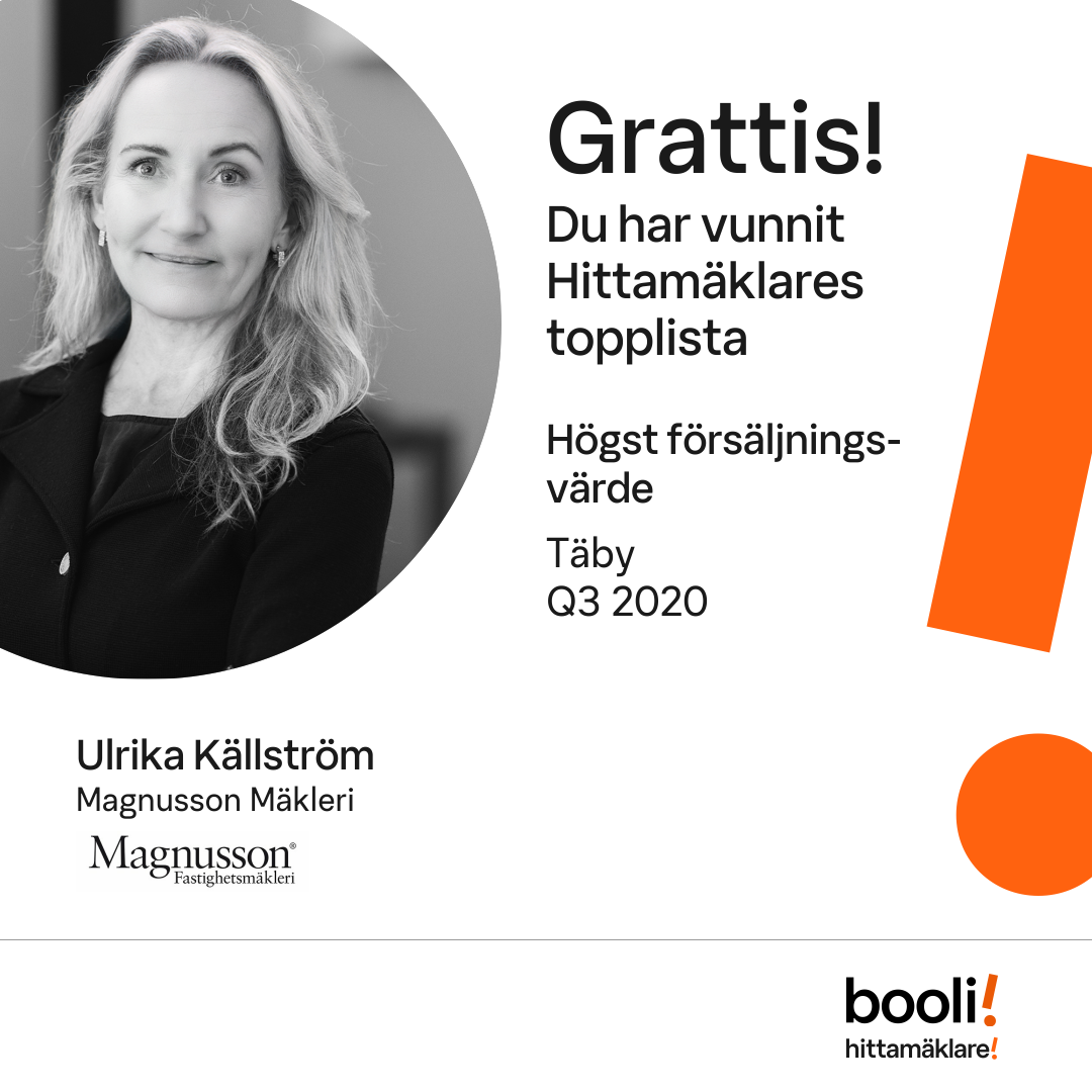 Statistik för publicerade bostäder, försäljningar och omdömen baseras på data från Booli och Hittamäklare. Statistiken för försäljningar avser inrapporterade och verifierade slutpriser från mäklare eller av Booli inhämtade och verifierade slutpriser. Statistiken för publicerade bostäder baseras på information som publicerats på Booli.se. Statistik för omdömen och rekommendationer baseras på omdömen från säljare som lämnats via Booli och Hittamäklare.
