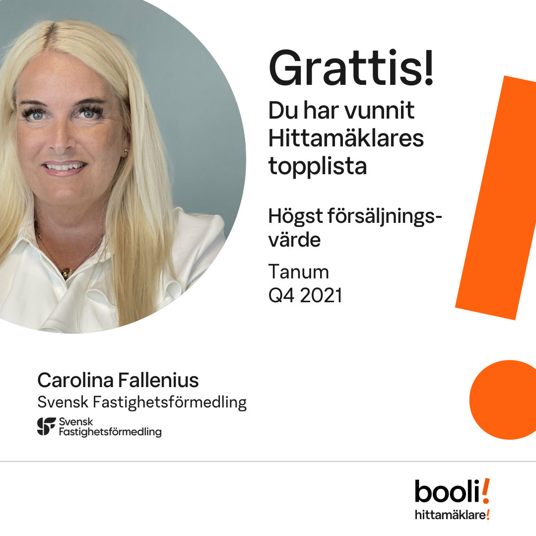 Statistik för publicerade bostäder, försäljningar och omdömen baseras på data från Booli och Hittamäklare. Statistiken för försäljningar avser inrapporterade och verifierade slutpriser från mäklare eller av Booli inhämtade och verifierade slutpriser. Statistiken för publicerade bostäder baseras på information som publicerats på Booli.se. Statistik för omdömen och rekommendationer baseras på omdömen från säljare som lämnats via Booli och Hittamäklare.