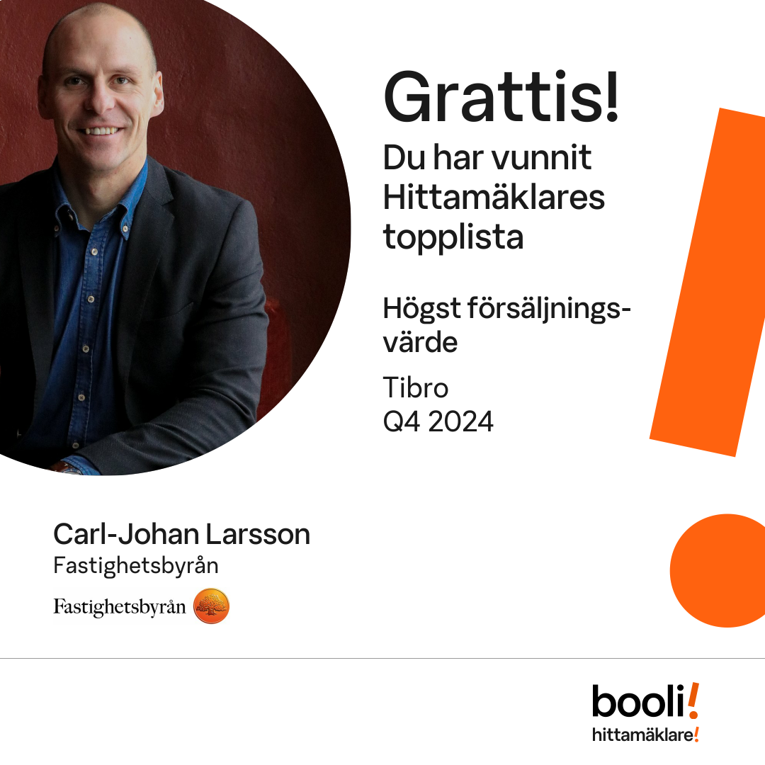 Statistik för publicerade bostäder, försäljningar och omdömen baseras på data från Booli och Hittamäklare. Statistiken för försäljningar avser inrapporterade och verifierade slutpriser från mäklare eller av Booli inhämtade och verifierade slutpriser. Statistiken för publicerade bostäder baseras på information som publicerats på Booli.se. Statistik för omdömen och rekommendationer baseras på omdömen från säljare som lämnats via Booli och Hittamäklare.