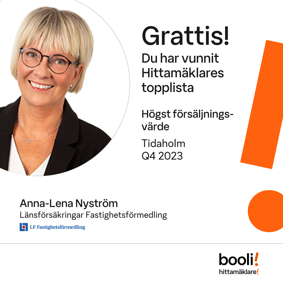 Statistik för publicerade bostäder, försäljningar och omdömen baseras på data från Booli och Hittamäklare. Statistiken för försäljningar avser inrapporterade och verifierade slutpriser från mäklare eller av Booli inhämtade och verifierade slutpriser. Statistiken för publicerade bostäder baseras på information som publicerats på Booli.se. Statistik för omdömen och rekommendationer baseras på omdömen från säljare som lämnats via Booli och Hittamäklare.