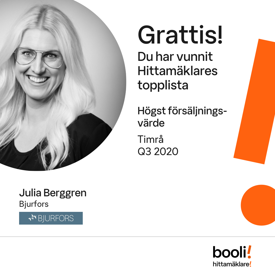 Statistik för publicerade bostäder, försäljningar och omdömen baseras på data från Booli och Hittamäklare. Statistiken för försäljningar avser inrapporterade och verifierade slutpriser från mäklare eller av Booli inhämtade och verifierade slutpriser. Statistiken för publicerade bostäder baseras på information som publicerats på Booli.se. Statistik för omdömen och rekommendationer baseras på omdömen från säljare som lämnats via Booli och Hittamäklare.