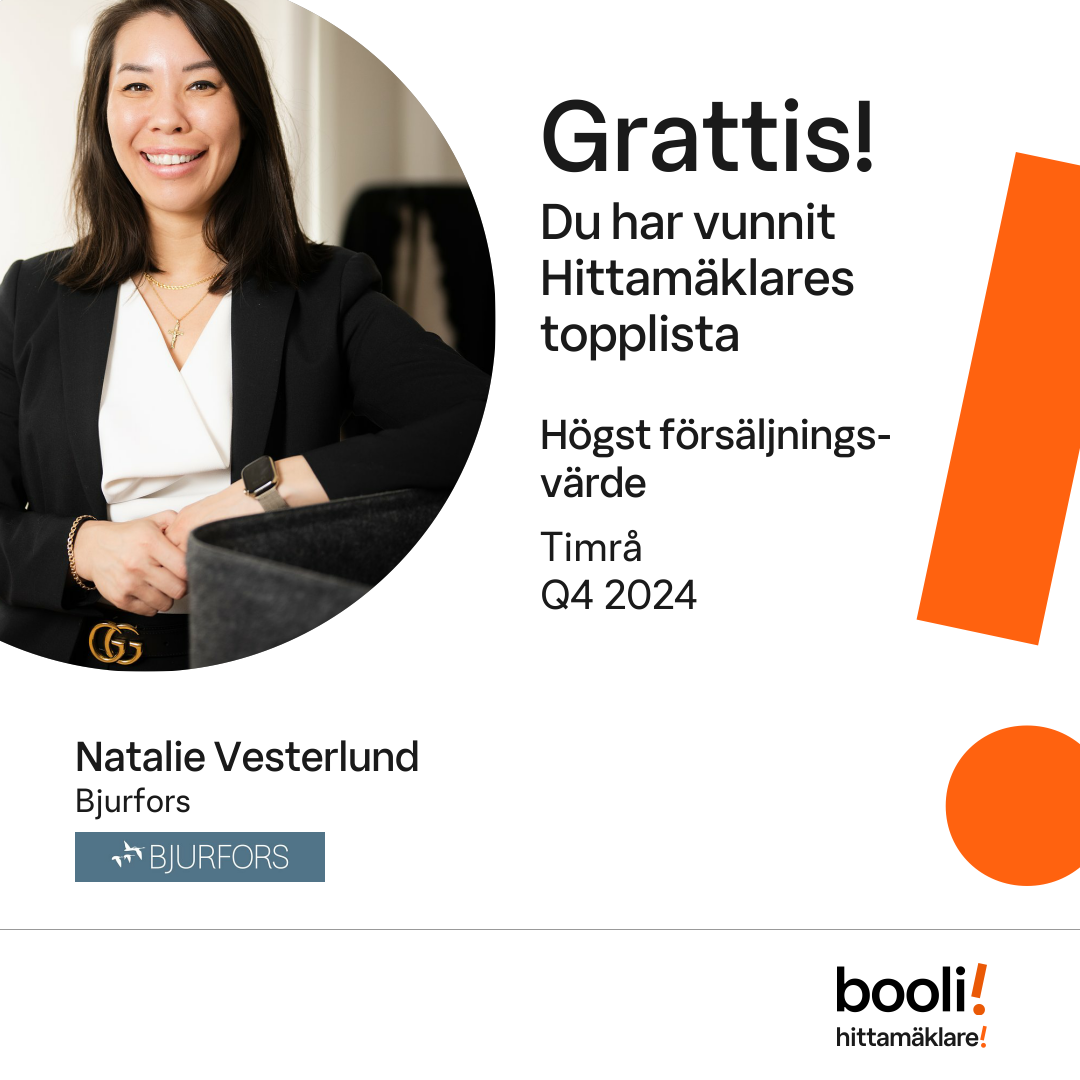 Statistik för publicerade bostäder, försäljningar och omdömen baseras på data från Booli och Hittamäklare. Statistiken för försäljningar avser inrapporterade och verifierade slutpriser från mäklare eller av Booli inhämtade och verifierade slutpriser. Statistiken för publicerade bostäder baseras på information som publicerats på Booli.se. Statistik för omdömen och rekommendationer baseras på omdömen från säljare som lämnats via Booli och Hittamäklare.
