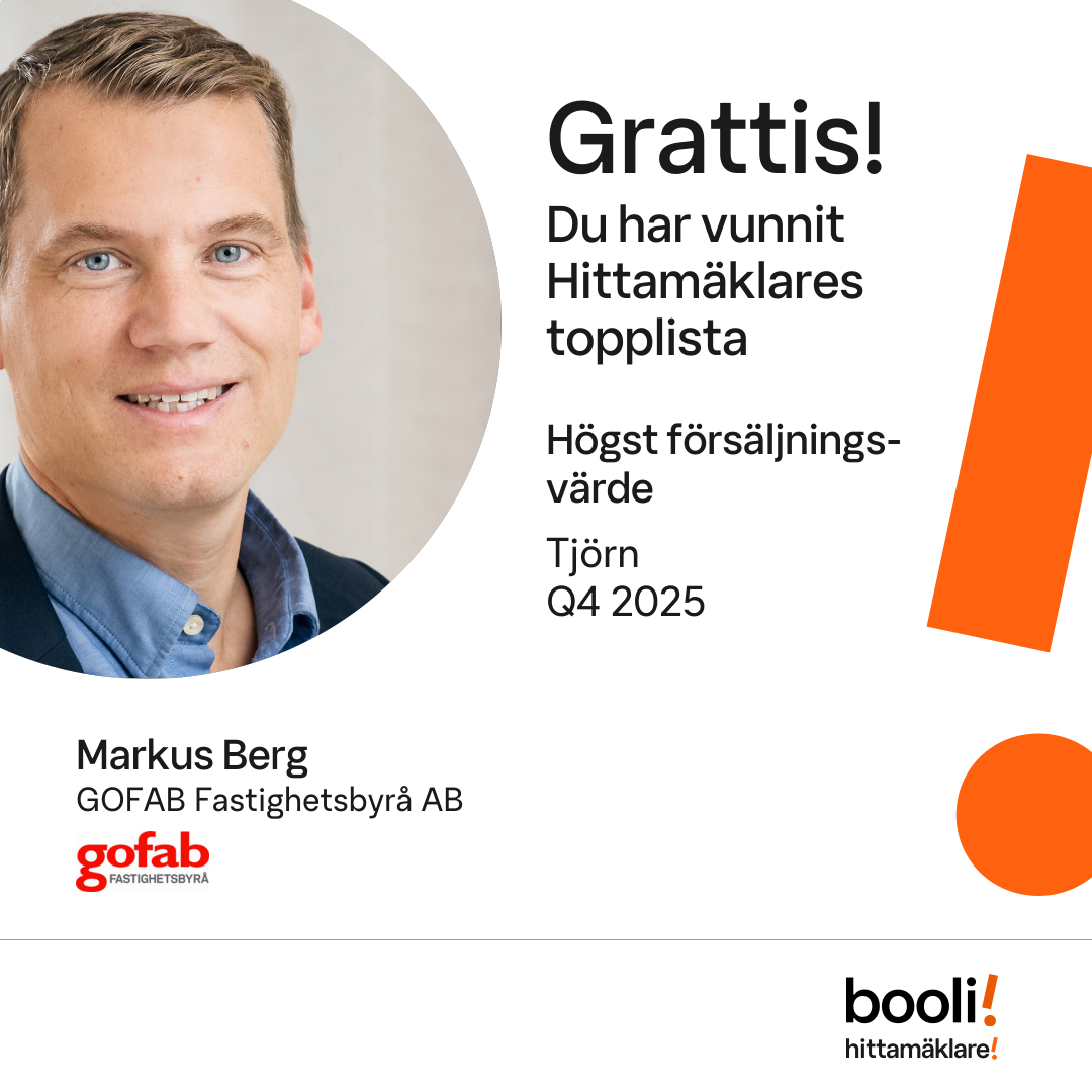 Statistik för publicerade bostäder, försäljningar och omdömen baseras på data från Booli och Hittamäklare. Statistiken för försäljningar avser inrapporterade och verifierade slutpriser från mäklare eller av Booli inhämtade och verifierade slutpriser. Statistiken för publicerade bostäder baseras på information som publicerats på Booli.se. Statistik för omdömen och rekommendationer baseras på omdömen från säljare som lämnats via Booli och Hittamäklare.
