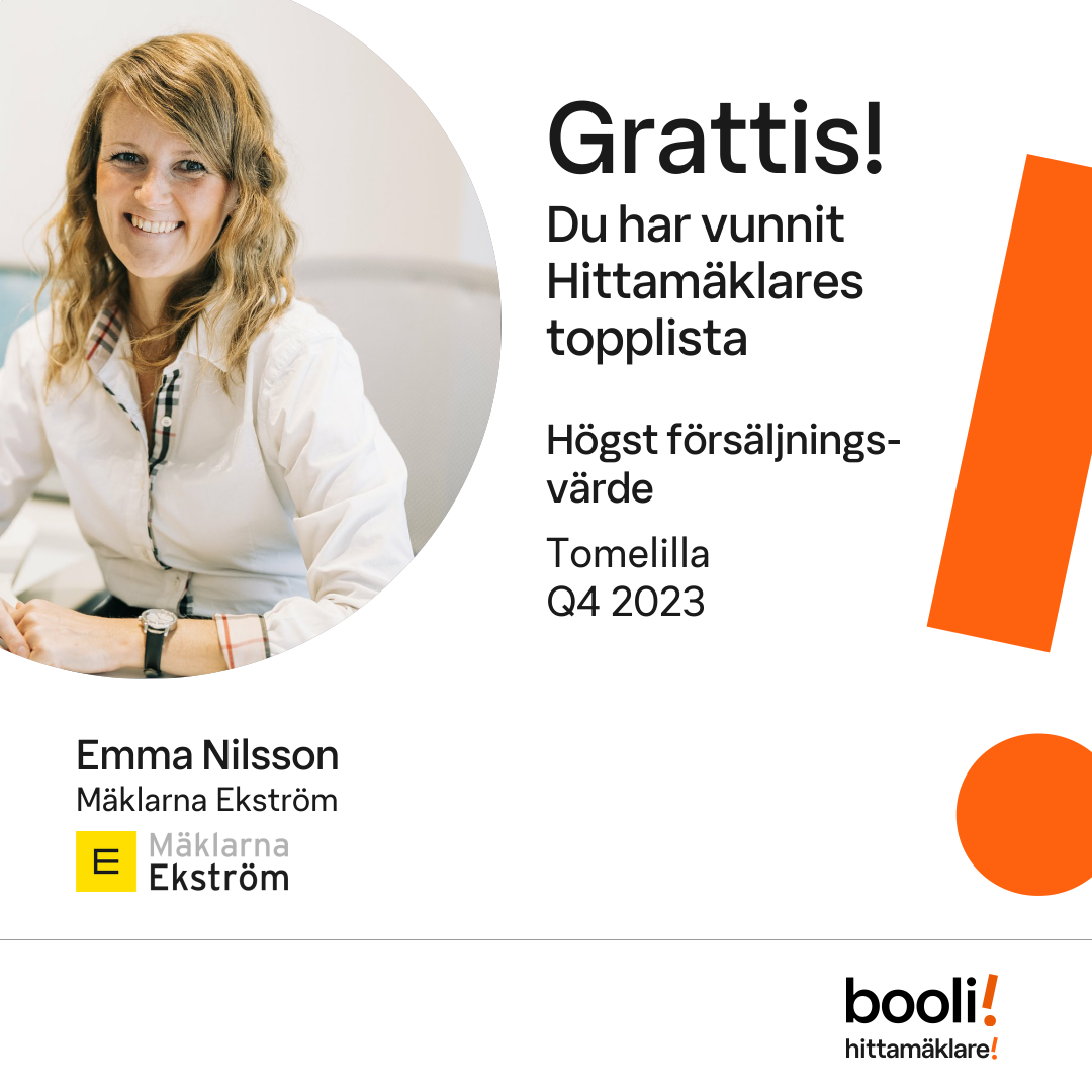 Statistik för publicerade bostäder, försäljningar och omdömen baseras på data från Booli och Hittamäklare. Statistiken för försäljningar avser inrapporterade och verifierade slutpriser från mäklare eller av Booli inhämtade och verifierade slutpriser. Statistiken för publicerade bostäder baseras på information som publicerats på Booli.se. Statistik för omdömen och rekommendationer baseras på omdömen från säljare som lämnats via Booli och Hittamäklare.