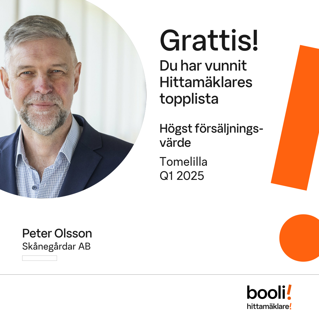 Statistik för publicerade bostäder, försäljningar och omdömen baseras på data från Booli och Hittamäklare. Statistiken för försäljningar avser inrapporterade och verifierade slutpriser från mäklare eller av Booli inhämtade och verifierade slutpriser. Statistiken för publicerade bostäder baseras på information som publicerats på Booli.se. Statistik för omdömen och rekommendationer baseras på omdömen från säljare som lämnats via Booli och Hittamäklare.