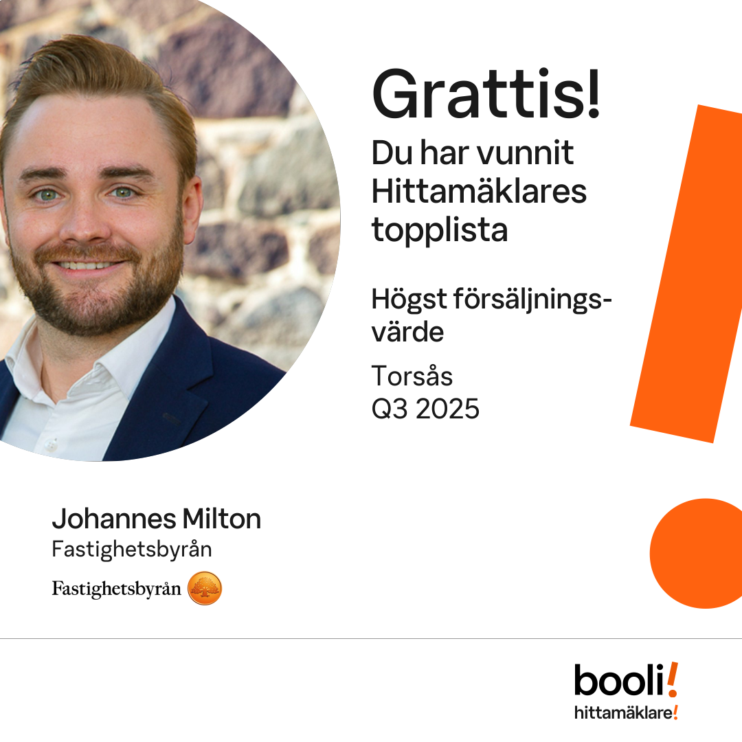 Statistik för publicerade bostäder, försäljningar och omdömen baseras på data från Booli och Hittamäklare. Statistiken för försäljningar avser inrapporterade och verifierade slutpriser från mäklare eller av Booli inhämtade och verifierade slutpriser. Statistiken för publicerade bostäder baseras på information som publicerats på Booli.se. Statistik för omdömen och rekommendationer baseras på omdömen från säljare som lämnats via Booli och Hittamäklare.