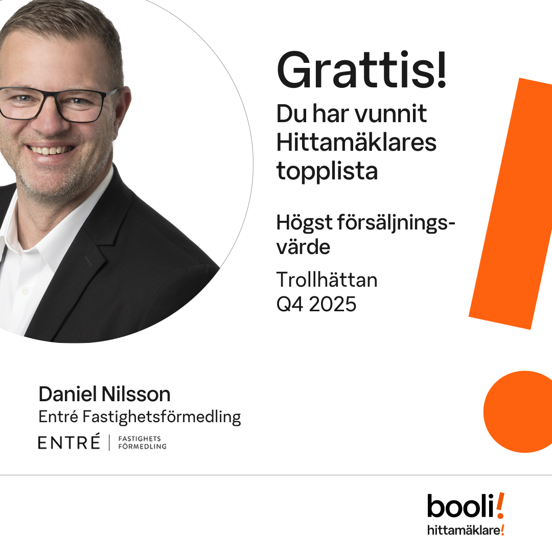 Statistik för publicerade bostäder, försäljningar och omdömen baseras på data från Booli och Hittamäklare. Statistiken för försäljningar avser inrapporterade och verifierade slutpriser från mäklare eller av Booli inhämtade och verifierade slutpriser. Statistiken för publicerade bostäder baseras på information som publicerats på Booli.se. Statistik för omdömen och rekommendationer baseras på omdömen från säljare som lämnats via Booli och Hittamäklare.