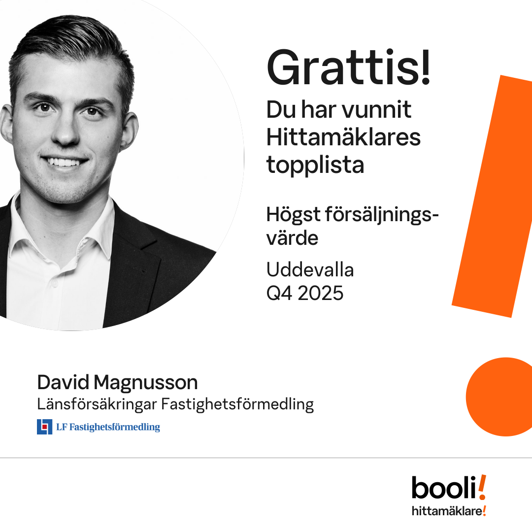 Statistik för publicerade bostäder, försäljningar och omdömen baseras på data från Booli. Statistiken för försäljningar avser inrapporterade och verifierade slutpriser från mäklare eller av Booli inhämtade och verifierade slutpriser. Statistiken för publicerade bostäder baseras på information som publicerats på Booli.se. Statistik för omdömen och rekommendationer baseras på omdömen från säljare som lämnats via Booli.