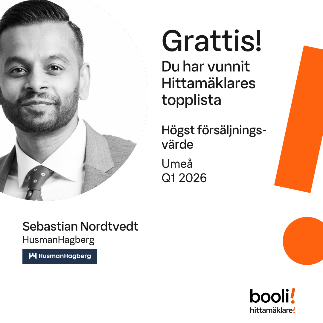 Statistik för publicerade bostäder, försäljningar och omdömen baseras på data från Booli. Statistiken för försäljningar avser inrapporterade och verifierade slutpriser från mäklare eller av Booli inhämtade och verifierade slutpriser. Statistiken för publicerade bostäder baseras på information som publicerats på Booli.se. Statistik för omdömen och rekommendationer baseras på omdömen från säljare som lämnats via Booli.