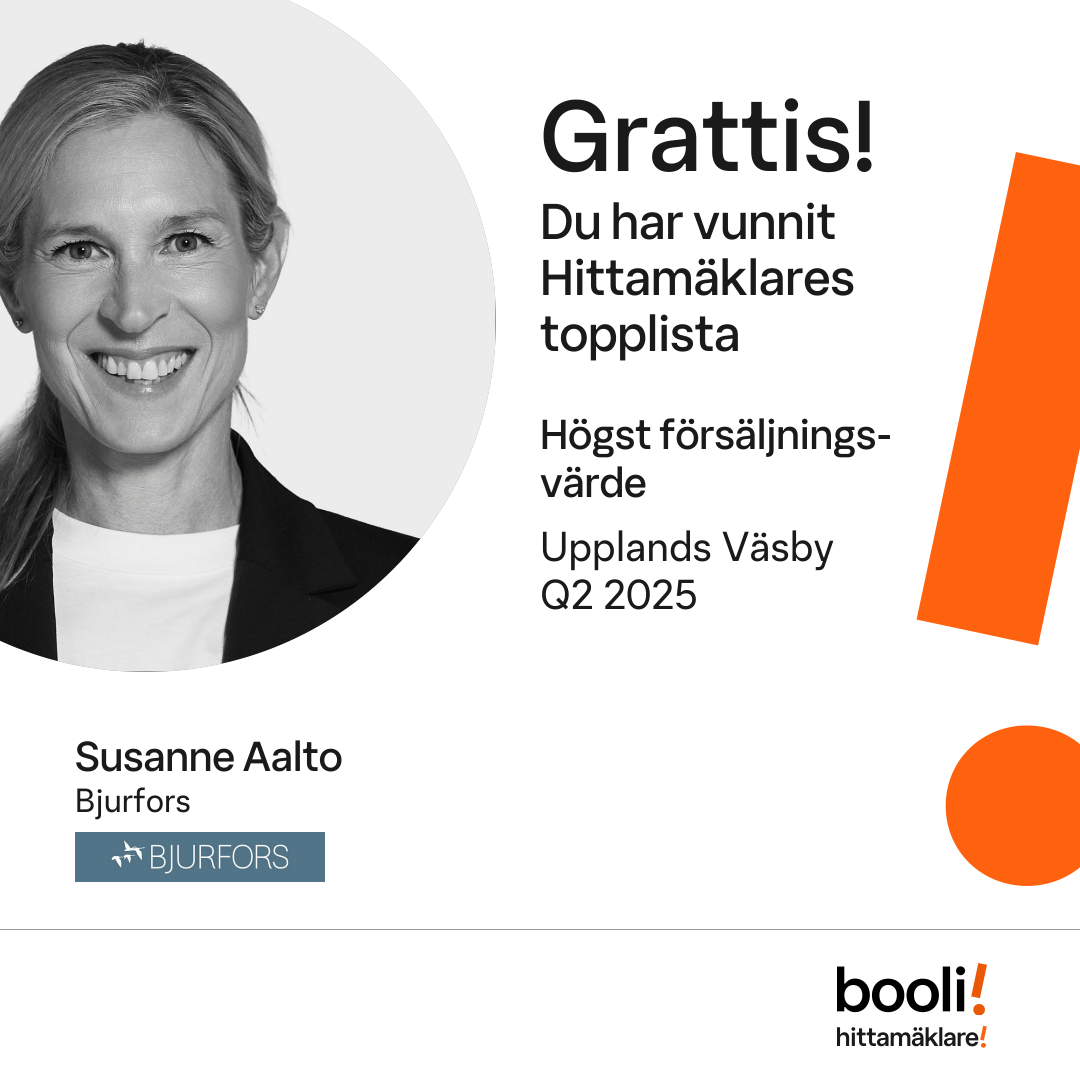 Statistik för publicerade bostäder, försäljningar och omdömen baseras på data från Booli och Hittamäklare. Statistiken för försäljningar avser inrapporterade och verifierade slutpriser från mäklare eller av Booli inhämtade och verifierade slutpriser. Statistiken för publicerade bostäder baseras på information som publicerats på Booli.se. Statistik för omdömen och rekommendationer baseras på omdömen från säljare som lämnats via Booli och Hittamäklare.