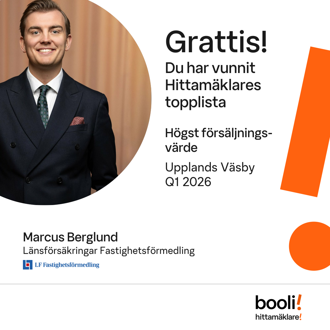 Statistik för publicerade bostäder, försäljningar och omdömen baseras på data från Booli. Statistiken för försäljningar avser inrapporterade och verifierade slutpriser från mäklare eller av Booli inhämtade och verifierade slutpriser. Statistiken för publicerade bostäder baseras på information som publicerats på Booli.se. Statistik för omdömen och rekommendationer baseras på omdömen från säljare som lämnats via Booli.