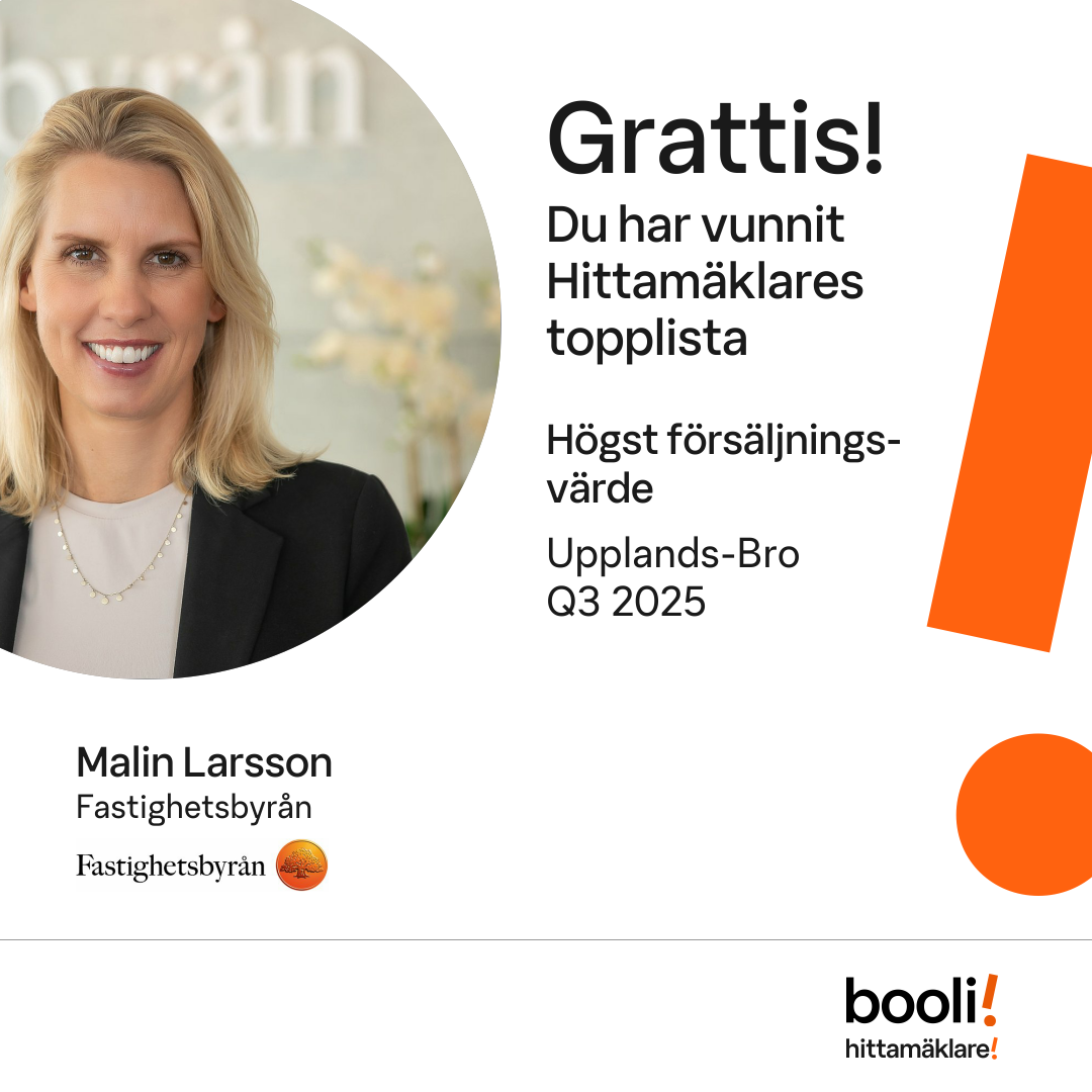 Statistik för publicerade bostäder, försäljningar och omdömen baseras på data från Booli och Hittamäklare. Statistiken för försäljningar avser inrapporterade och verifierade slutpriser från mäklare eller av Booli inhämtade och verifierade slutpriser. Statistiken för publicerade bostäder baseras på information som publicerats på Booli.se. Statistik för omdömen och rekommendationer baseras på omdömen från säljare som lämnats via Booli och Hittamäklare.