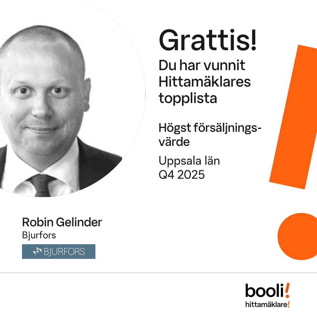 Statistik för publicerade bostäder, försäljningar och omdömen baseras på data från Booli och Hittamäklare. Statistiken för försäljningar avser inrapporterade och verifierade slutpriser från mäklare eller av Booli inhämtade och verifierade slutpriser. Statistiken för publicerade bostäder baseras på information som publicerats på Booli.se. Statistik för omdömen och rekommendationer baseras på omdömen från säljare som lämnats via Booli och Hittamäklare.
