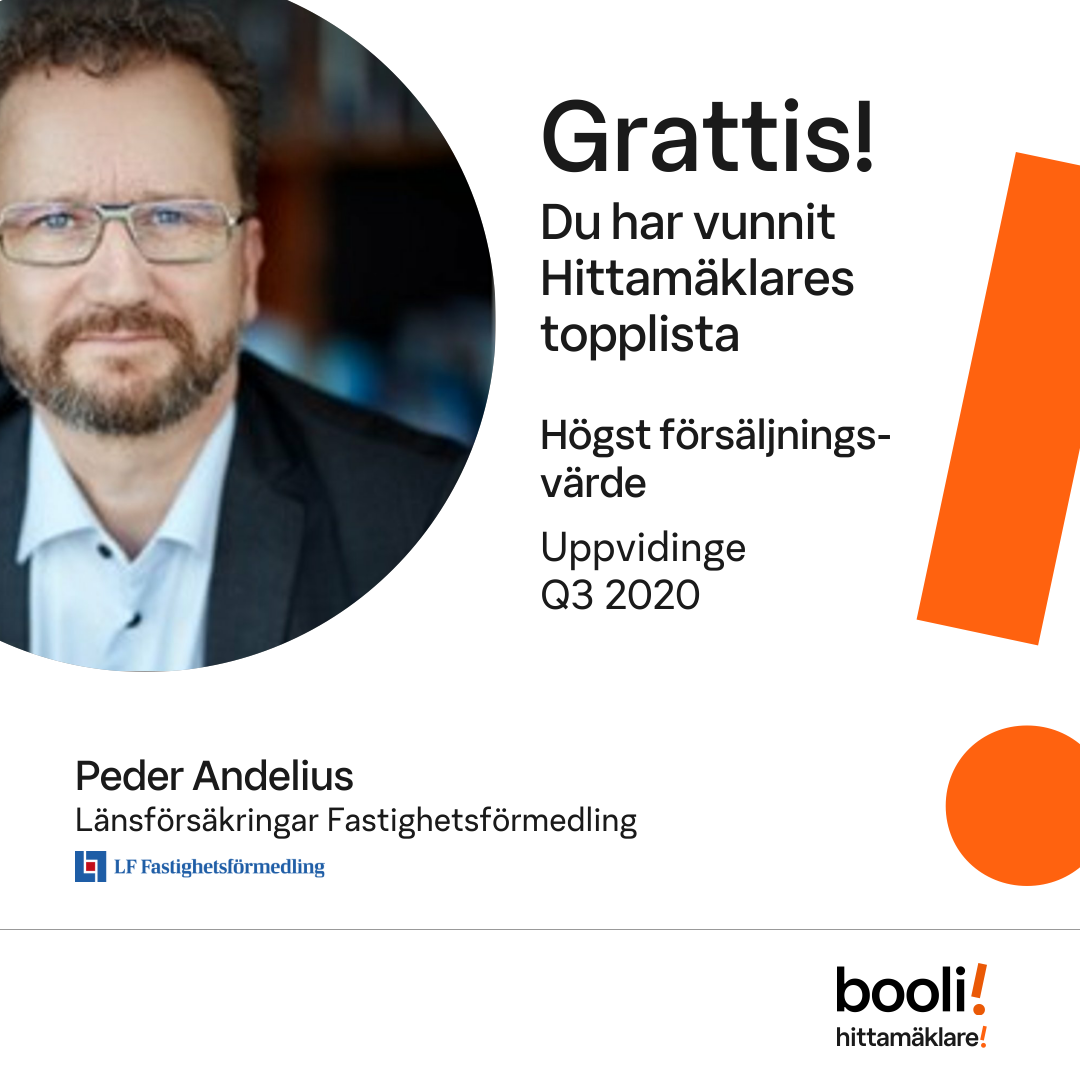 Statistik för publicerade bostäder, försäljningar och omdömen baseras på data från Booli och Hittamäklare. Statistiken för försäljningar avser inrapporterade och verifierade slutpriser från mäklare eller av Booli inhämtade och verifierade slutpriser. Statistiken för publicerade bostäder baseras på information som publicerats på Booli.se. Statistik för omdömen och rekommendationer baseras på omdömen från säljare som lämnats via Booli och Hittamäklare.