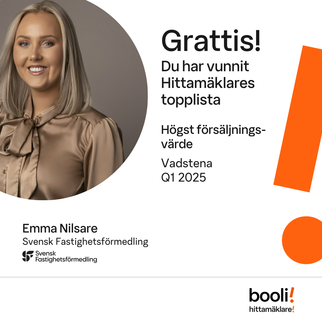 Statistik för publicerade bostäder, försäljningar och omdömen baseras på data från Booli och Hittamäklare. Statistiken för försäljningar avser inrapporterade och verifierade slutpriser från mäklare eller av Booli inhämtade och verifierade slutpriser. Statistiken för publicerade bostäder baseras på information som publicerats på Booli.se. Statistik för omdömen och rekommendationer baseras på omdömen från säljare som lämnats via Booli och Hittamäklare.