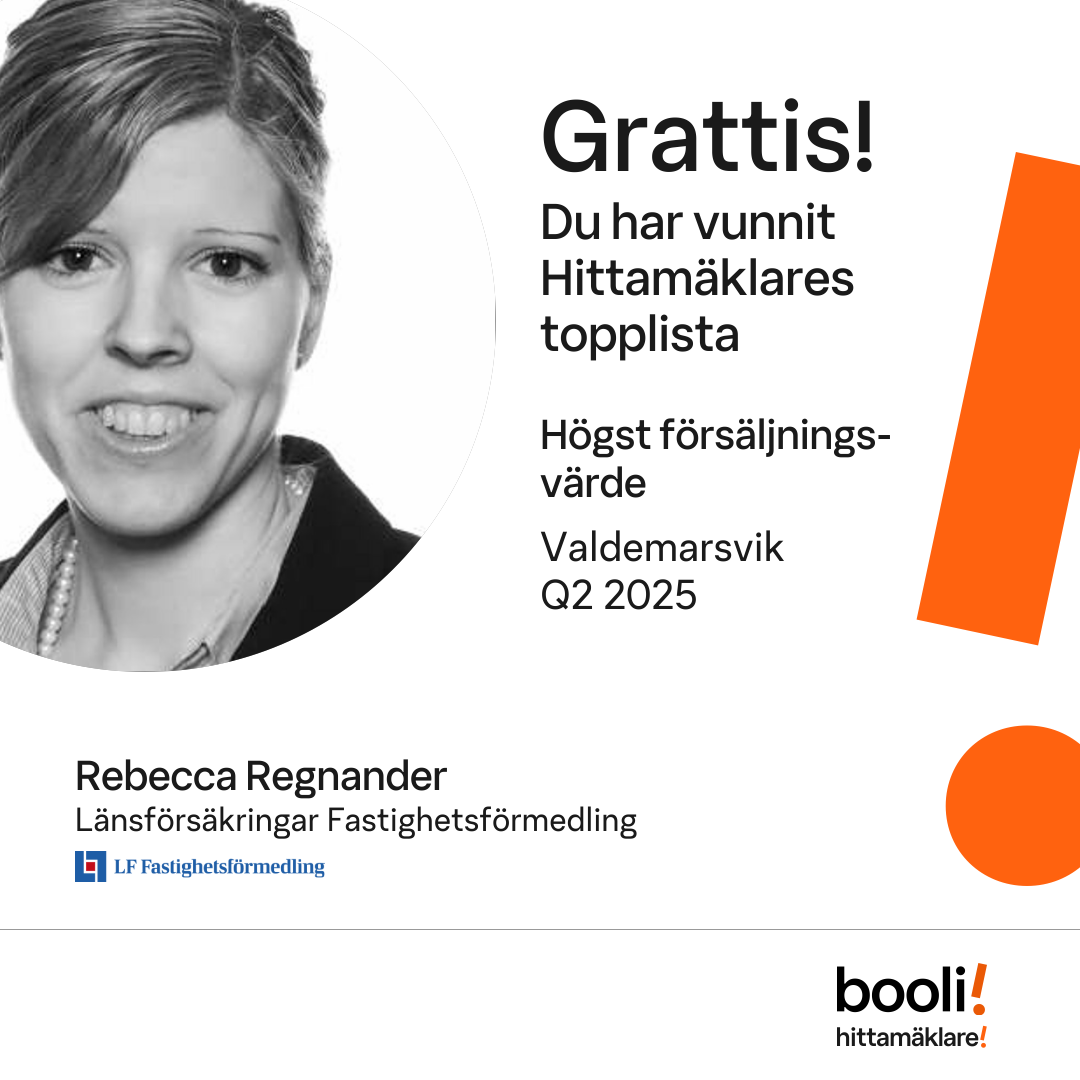 Statistik för publicerade bostäder, försäljningar och omdömen baseras på data från Booli och Hittamäklare. Statistiken för försäljningar avser inrapporterade och verifierade slutpriser från mäklare eller av Booli inhämtade och verifierade slutpriser. Statistiken för publicerade bostäder baseras på information som publicerats på Booli.se. Statistik för omdömen och rekommendationer baseras på omdömen från säljare som lämnats via Booli och Hittamäklare.