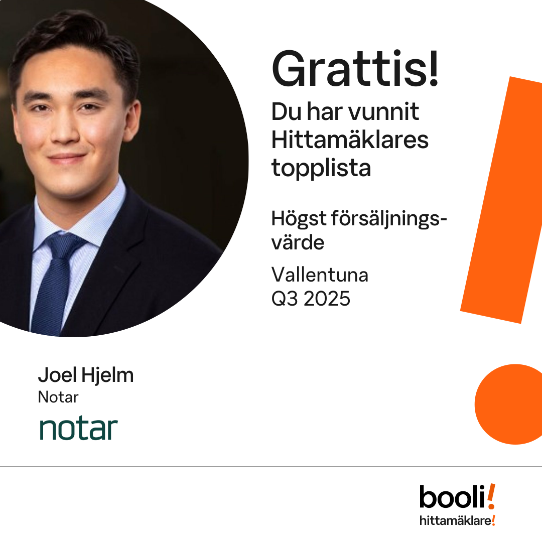 Statistik för publicerade bostäder, försäljningar och omdömen baseras på data från Booli och Hittamäklare. Statistiken för försäljningar avser inrapporterade och verifierade slutpriser från mäklare eller av Booli inhämtade och verifierade slutpriser. Statistiken för publicerade bostäder baseras på information som publicerats på Booli.se. Statistik för omdömen och rekommendationer baseras på omdömen från säljare som lämnats via Booli och Hittamäklare.