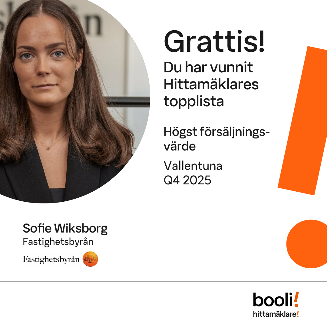 Statistik för publicerade bostäder, försäljningar och omdömen baseras på data från Booli och Hittamäklare. Statistiken för försäljningar avser inrapporterade och verifierade slutpriser från mäklare eller av Booli inhämtade och verifierade slutpriser. Statistiken för publicerade bostäder baseras på information som publicerats på Booli.se. Statistik för omdömen och rekommendationer baseras på omdömen från säljare som lämnats via Booli och Hittamäklare.