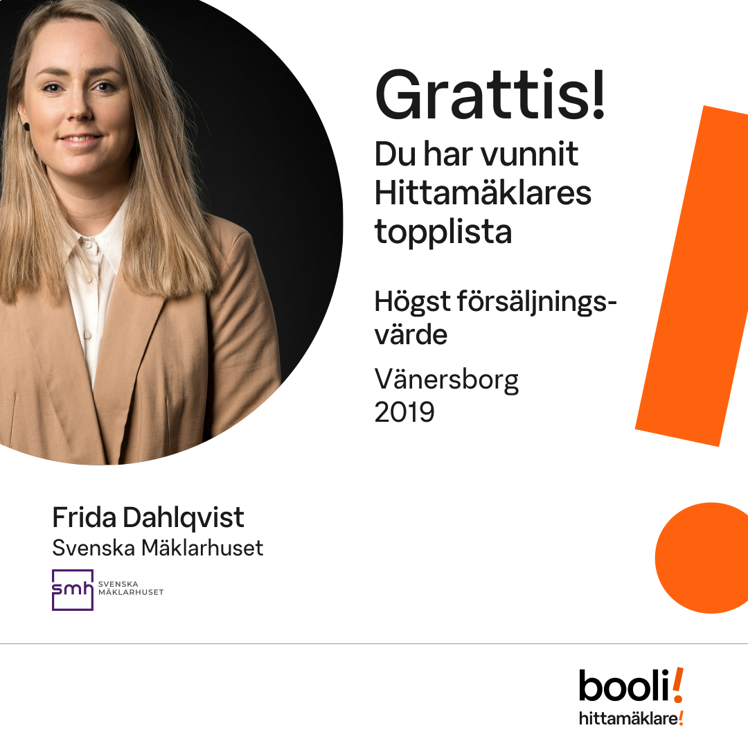 Statistik för publicerade bostäder, försäljningar och omdömen baseras på data från Booli och Hittamäklare. Statistiken för försäljningar avser inrapporterade och verifierade slutpriser från mäklare eller av Booli inhämtade och verifierade slutpriser. Statistiken för publicerade bostäder baseras på information som publicerats på Booli.se. Statistik för omdömen och rekommendationer baseras på omdömen från säljare som lämnats via Booli och Hittamäklare.