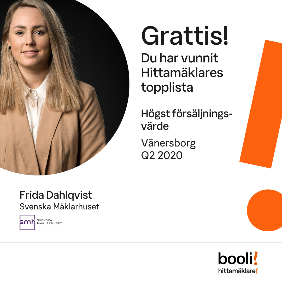 Statistik för publicerade bostäder, försäljningar och omdömen baseras på data från Booli och Hittamäklare. Statistiken för försäljningar avser inrapporterade och verifierade slutpriser från mäklare eller av Booli inhämtade och verifierade slutpriser. Statistiken för publicerade bostäder baseras på information som publicerats på Booli.se. Statistik för omdömen och rekommendationer baseras på omdömen från säljare som lämnats via Booli och Hittamäklare.