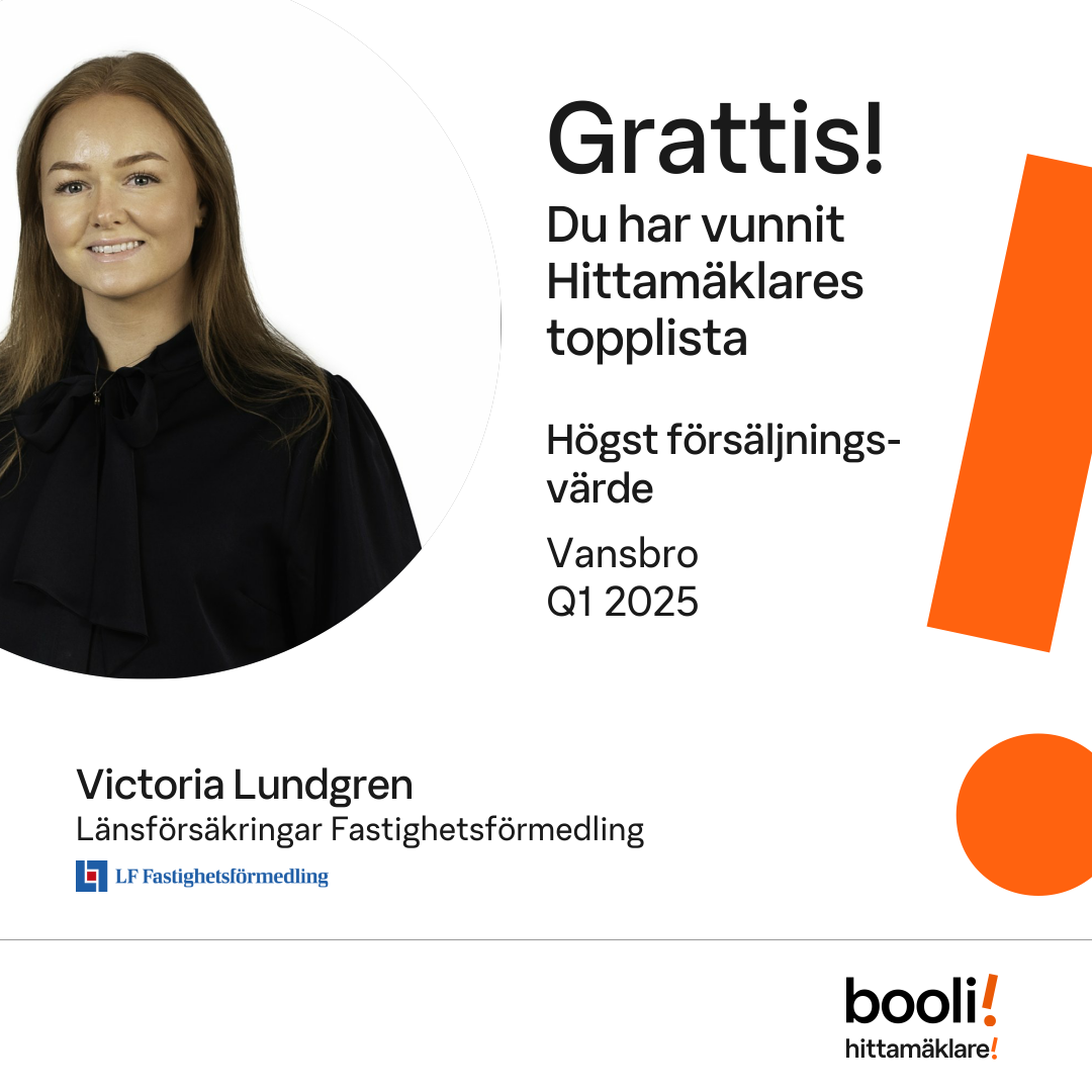 Statistik för publicerade bostäder, försäljningar och omdömen baseras på data från Booli och Hittamäklare. Statistiken för försäljningar avser inrapporterade och verifierade slutpriser från mäklare eller av Booli inhämtade och verifierade slutpriser. Statistiken för publicerade bostäder baseras på information som publicerats på Booli.se. Statistik för omdömen och rekommendationer baseras på omdömen från säljare som lämnats via Booli och Hittamäklare.