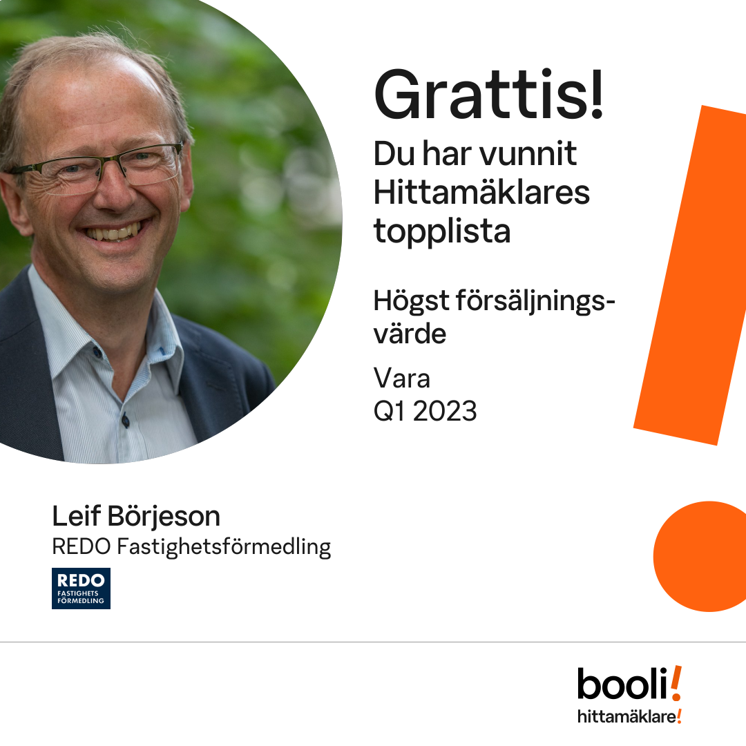 Statistik för publicerade bostäder, försäljningar och omdömen baseras på data från Booli och Hittamäklare. Statistiken för försäljningar avser inrapporterade och verifierade slutpriser från mäklare eller av Booli inhämtade och verifierade slutpriser. Statistiken för publicerade bostäder baseras på information som publicerats på Booli.se. Statistik för omdömen och rekommendationer baseras på omdömen från säljare som lämnats via Booli och Hittamäklare.