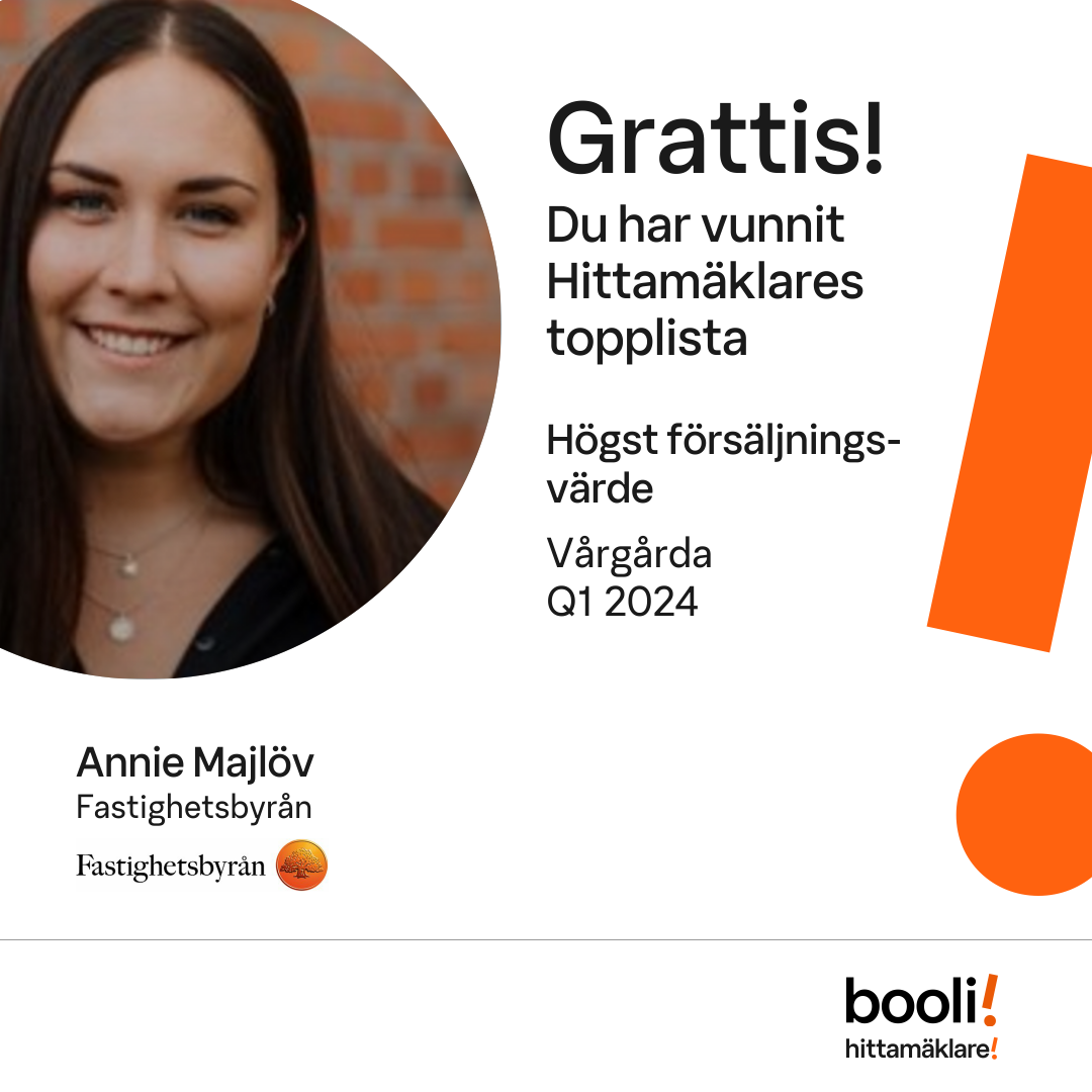Statistik för publicerade bostäder, försäljningar och omdömen baseras på data från Booli och Hittamäklare. Statistiken för försäljningar avser inrapporterade och verifierade slutpriser från mäklare eller av Booli inhämtade och verifierade slutpriser. Statistiken för publicerade bostäder baseras på information som publicerats på Booli.se. Statistik för omdömen och rekommendationer baseras på omdömen från säljare som lämnats via Booli och Hittamäklare.