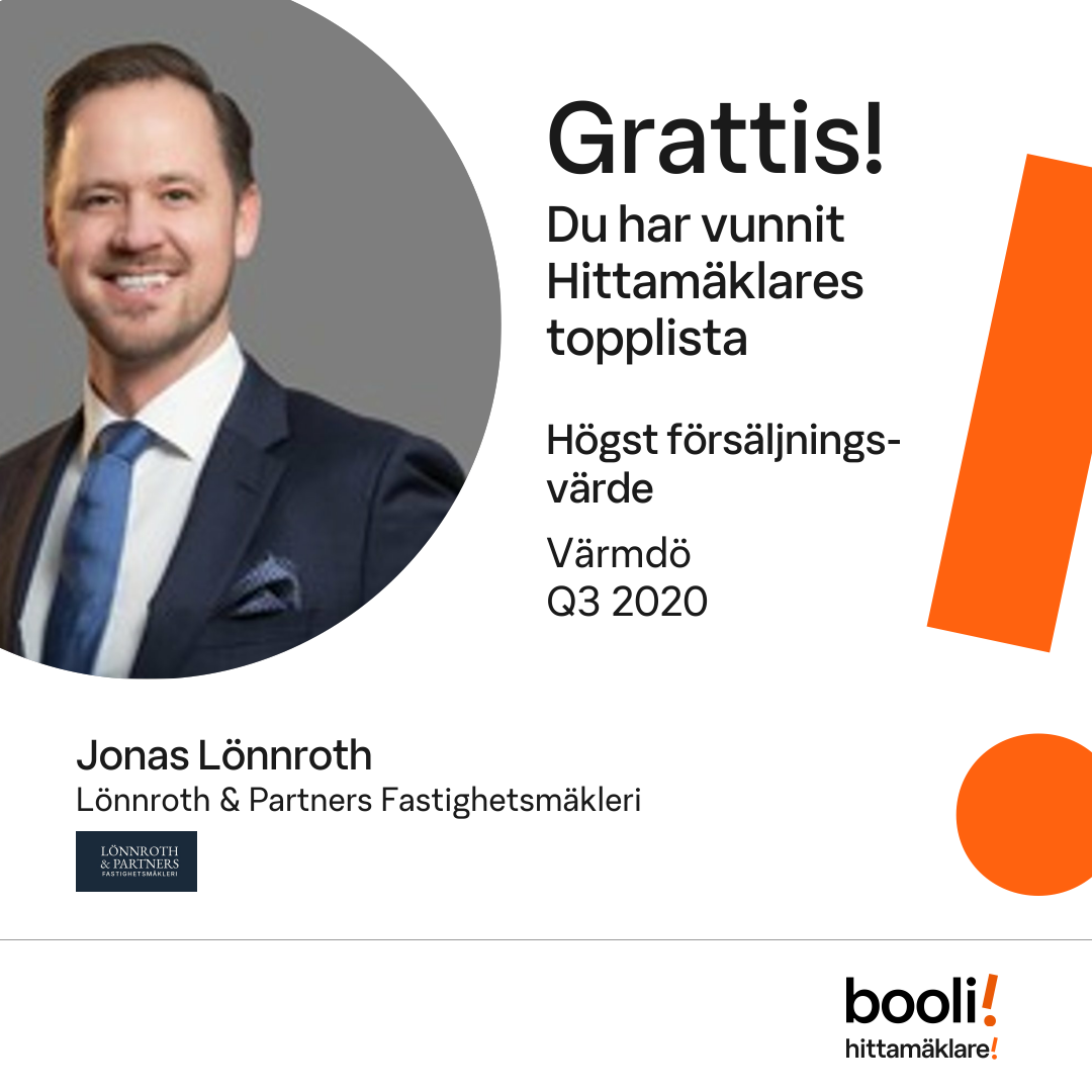 Statistik för publicerade bostäder, försäljningar och omdömen baseras på data från Booli och Hittamäklare. Statistiken för försäljningar avser inrapporterade och verifierade slutpriser från mäklare eller av Booli inhämtade och verifierade slutpriser. Statistiken för publicerade bostäder baseras på information som publicerats på Booli.se. Statistik för omdömen och rekommendationer baseras på omdömen från säljare som lämnats via Booli och Hittamäklare.