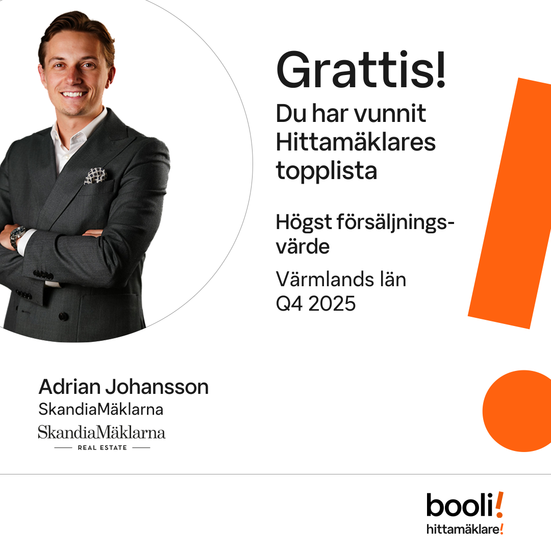 Statistik för publicerade bostäder, försäljningar och omdömen baseras på data från Booli och Hittamäklare. Statistiken för försäljningar avser inrapporterade och verifierade slutpriser från mäklare eller av Booli inhämtade och verifierade slutpriser. Statistiken för publicerade bostäder baseras på information som publicerats på Booli.se. Statistik för omdömen och rekommendationer baseras på omdömen från säljare som lämnats via Booli och Hittamäklare.