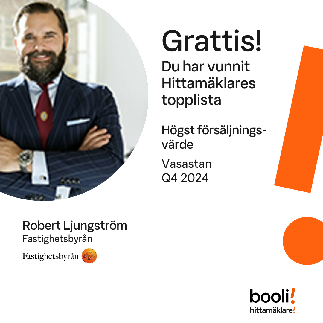 Statistik för publicerade bostäder, försäljningar och omdömen baseras på data från Booli och Hittamäklare. Statistiken för försäljningar avser inrapporterade och verifierade slutpriser från mäklare eller av Booli inhämtade och verifierade slutpriser. Statistiken för publicerade bostäder baseras på information som publicerats på Booli.se. Statistik för omdömen och rekommendationer baseras på omdömen från säljare som lämnats via Booli och Hittamäklare.