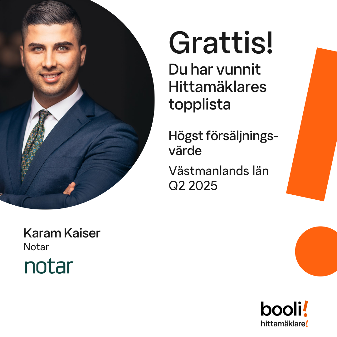 Statistik för publicerade bostäder, försäljningar och omdömen baseras på data från Booli och Hittamäklare. Statistiken för försäljningar avser inrapporterade och verifierade slutpriser från mäklare eller av Booli inhämtade och verifierade slutpriser. Statistiken för publicerade bostäder baseras på information som publicerats på Booli.se. Statistik för omdömen och rekommendationer baseras på omdömen från säljare som lämnats via Booli och Hittamäklare.