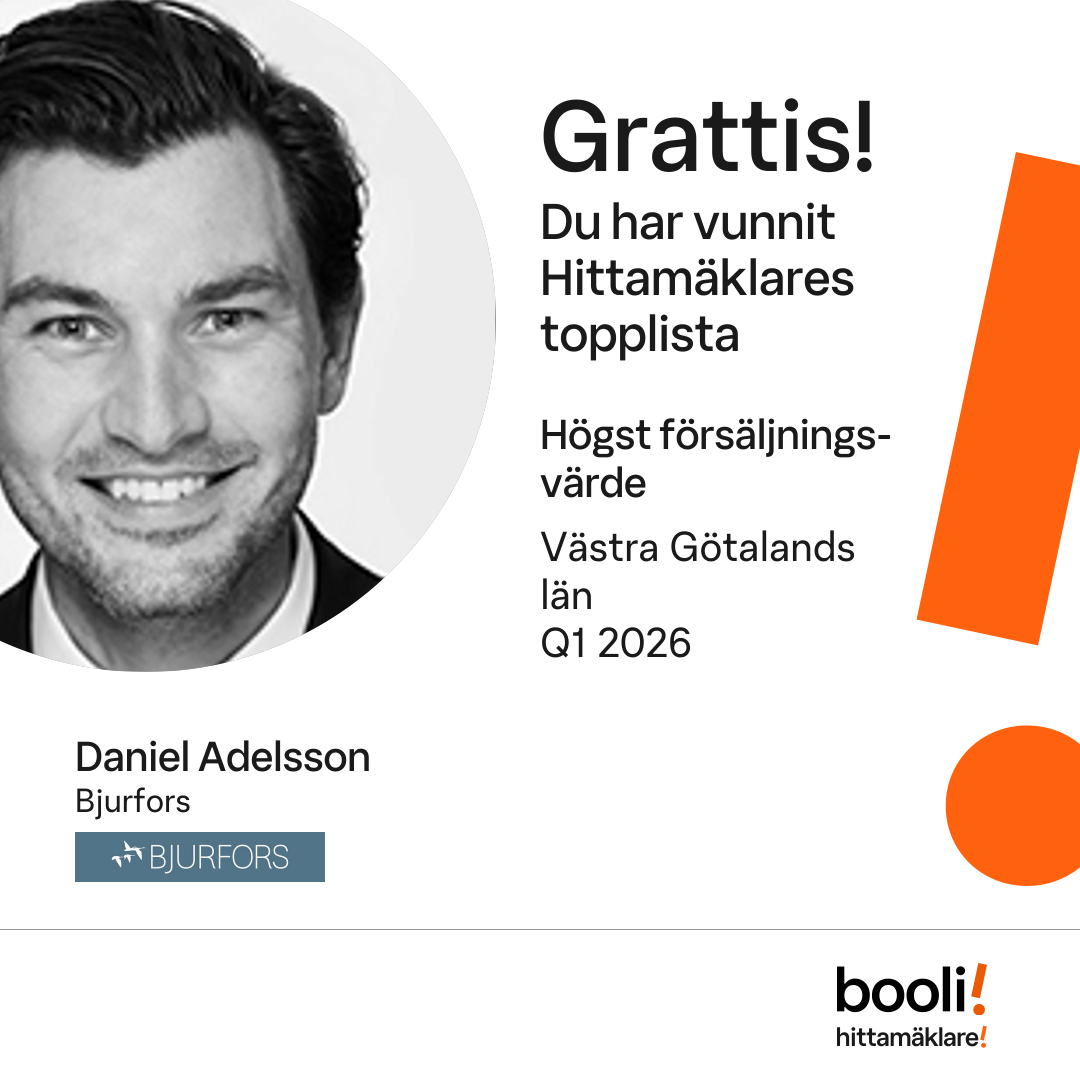 Statistik för publicerade bostäder, försäljningar och omdömen baseras på data från Booli och Hittamäklare. Statistiken för försäljningar avser inrapporterade och verifierade slutpriser från mäklare eller av Booli inhämtade och verifierade slutpriser. Statistiken för publicerade bostäder baseras på information som publicerats på Booli.se. Statistik för omdömen och rekommendationer baseras på omdömen från säljare som lämnats via Booli och Hittamäklare.