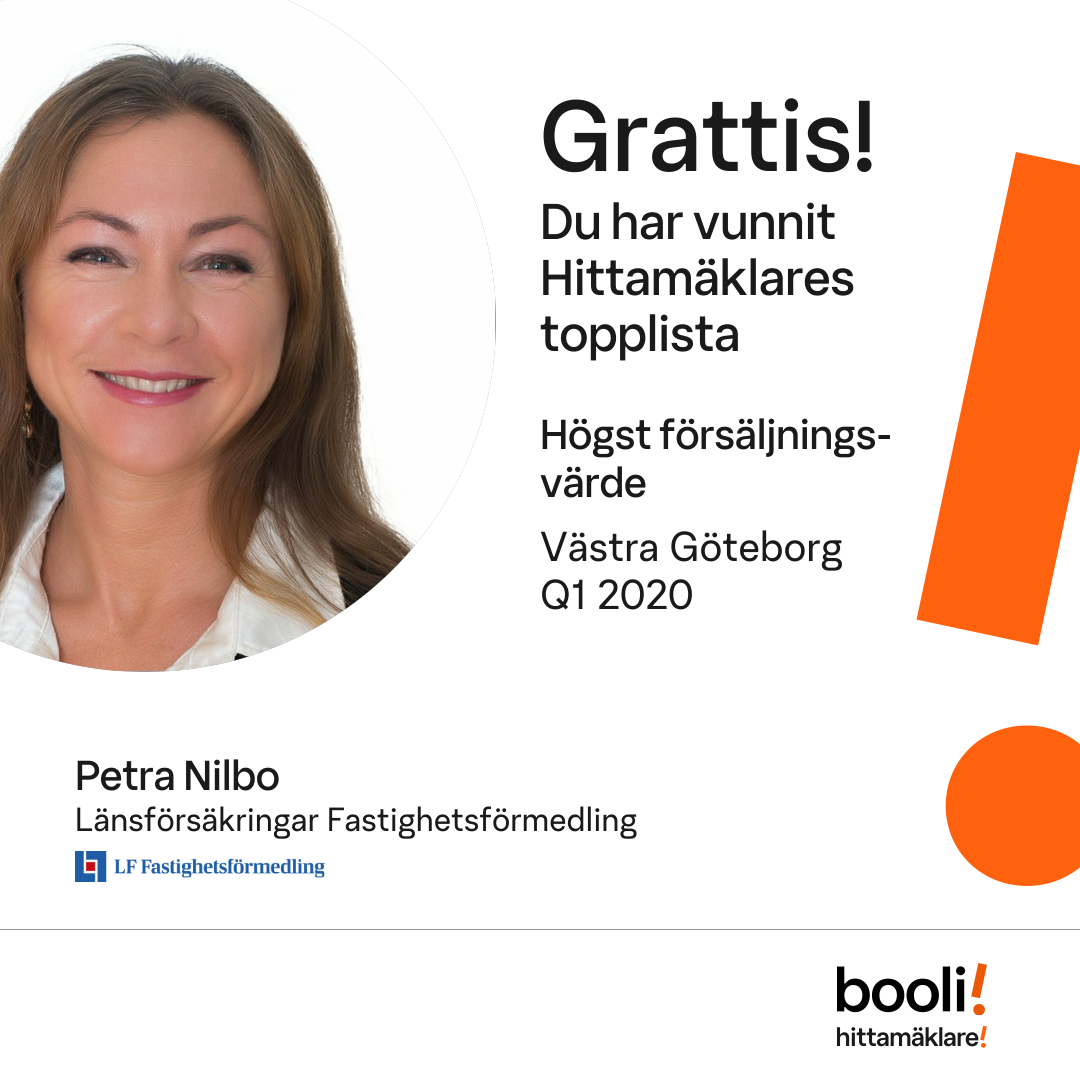 Statistik för publicerade bostäder, försäljningar och omdömen baseras på data från Booli och Hittamäklare. Statistiken för försäljningar avser inrapporterade och verifierade slutpriser från mäklare eller av Booli inhämtade och verifierade slutpriser. Statistiken för publicerade bostäder baseras på information som publicerats på Booli.se. Statistik för omdömen och rekommendationer baseras på omdömen från säljare som lämnats via Booli och Hittamäklare.