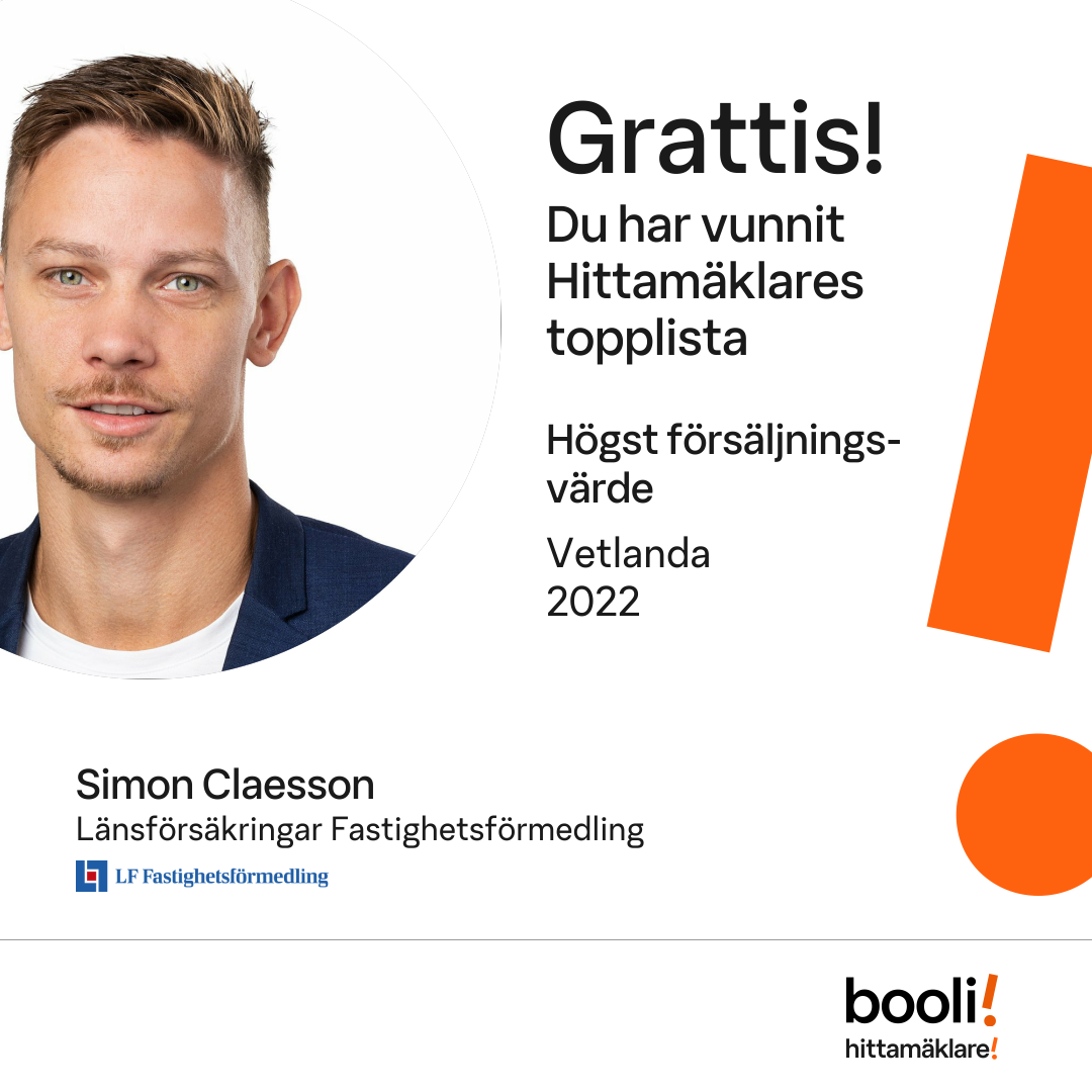 Statistik för publicerade bostäder, försäljningar och omdömen baseras på data från Booli och Hittamäklare. Statistiken för försäljningar avser inrapporterade och verifierade slutpriser från mäklare eller av Booli inhämtade och verifierade slutpriser. Statistiken för publicerade bostäder baseras på information som publicerats på Booli.se. Statistik för omdömen och rekommendationer baseras på omdömen från säljare som lämnats via Booli och Hittamäklare.
