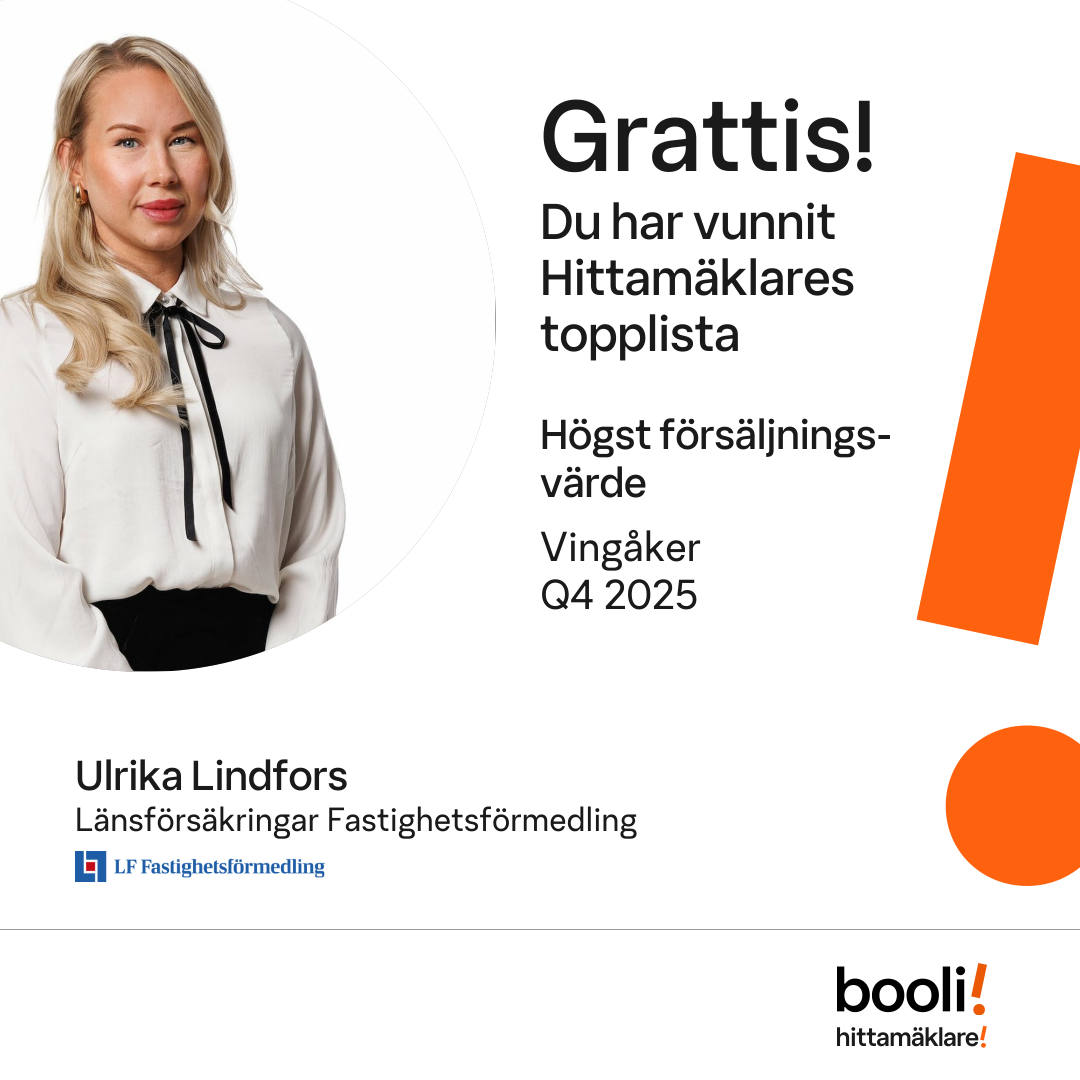 Statistik för publicerade bostäder, försäljningar och omdömen baseras på data från Booli och Hittamäklare. Statistiken för försäljningar avser inrapporterade och verifierade slutpriser från mäklare eller av Booli inhämtade och verifierade slutpriser. Statistiken för publicerade bostäder baseras på information som publicerats på Booli.se. Statistik för omdömen och rekommendationer baseras på omdömen från säljare som lämnats via Booli och Hittamäklare.
